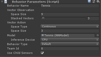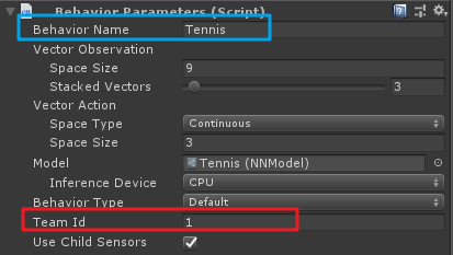 可以看到两个球拍的行为参数,Team Id是不同的,表示了两个不同的阵营,猜测如果有多方阵营也可以训练,还有这里应该是使用Behavior Name来保证训练的Brain一致,在前几面的文章中也有提及。