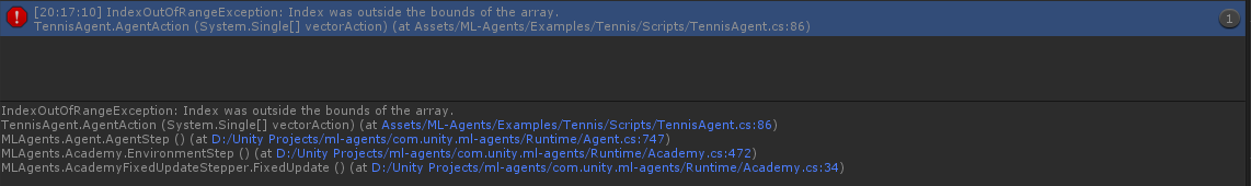 这里是说agent的返回的矢量动作空间数量有问题,如果你比较熟悉ML-Agents之后,你会发现在AgentAction(float[] vectorAction)中,vectorAction[]数组有三个元素,分别控制了球拍的x、y方向移动以及球拍的绕z轴的旋转。而在以上Huristic()代码中,action[]数组只有两个元素,只控制了球拍的x、y方向移动,缺少绕z轴的旋转的行为参数。