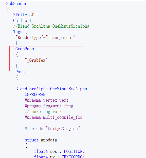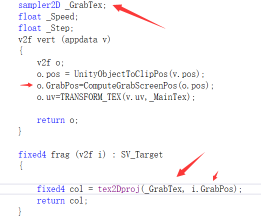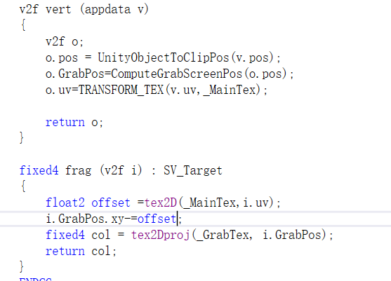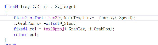 这里我们需要引入一个新的Pass: GrabPass { "_GrabTex" } GrabPass就是用来捕获当前画面的,而中括号里,就是我们捕获图片的变量名。 值得注意的是,此Pass如果用在移动平台上,会耗费大量性能,不推荐使用。如果非得使用,利用后处理中的Graphic.Bilt()思路性能耗费相对较低。 我们用用看: 首先是它的位置: 接下来是用法: 我们利用如上代码,我们的模型,就变成了完全的“透明”状态,其实只是贴图覆盖,就是贴图和背景是一模一样的: 接下来,我们实现扭曲效果: 加上我们上面的扭曲代码,需要注意的是,主帖图,换成我们的抓屏了哦: 这样一来,扭曲效果就实现啦~: 静态扭曲倒是实现了,但是我们需要动态的,提到动态,我们自然而然就想到_Time,这里出现了大量的黑色区域,别担心,这是因为扭曲幅度过大导致,这里我们加入两个变量来控制速度和幅度: 其中_Speed可以控制速度,_Step可以控制偏移幅度。
