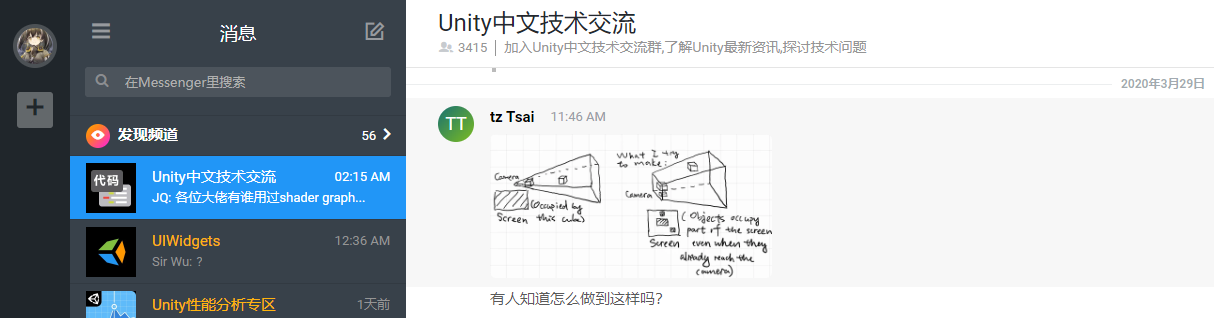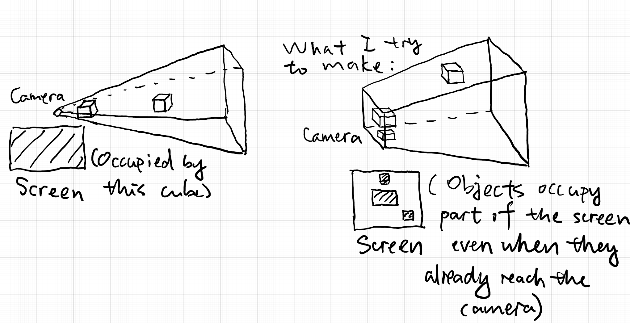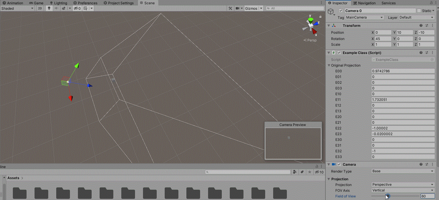 前几天,有位群友问了这样一个问题: 事实上,由于相机的近裁面即为投影面,所以我们仅需将图一中的相机向后撤一些,然后把近裁面距离调大就好。但这突然让我产生了一些疑问:投影面一定得是矩形吗?投影面一定要垂直于相机自身的Z轴吗?可以看到,调整Inspector面板上的参数是无济于事的: 仿佛常识一样,投影面就该是矩形的,且始终垂直于相机的Z轴。不过之后我发现了Camera类中有一些公开的变量,却没有被显示在Inspector面板中,比方说它: Camera.projectionMatrix 官方手册上简单地说了下它是用来设置自定义投影面的,并给出这样一个生动的案例。我们把代码复制到工程里,运行看一下效果: 正如官方说明,相机的投影规则是完全可以自定义设置的。