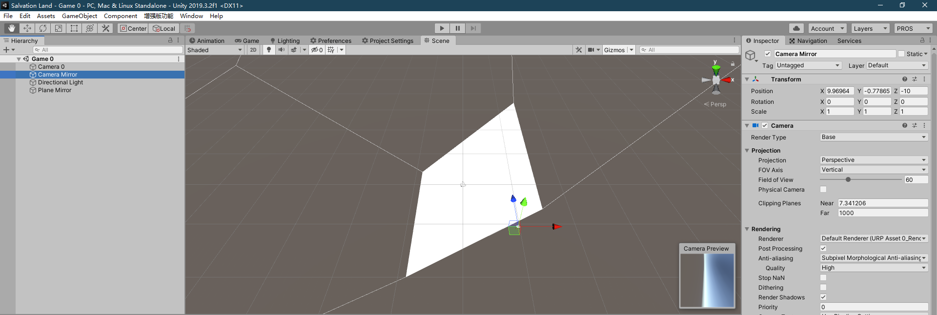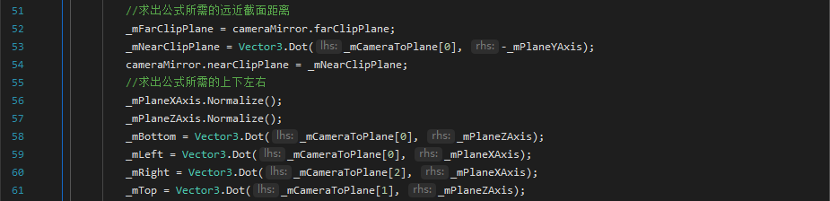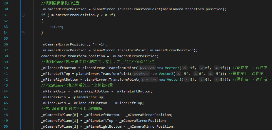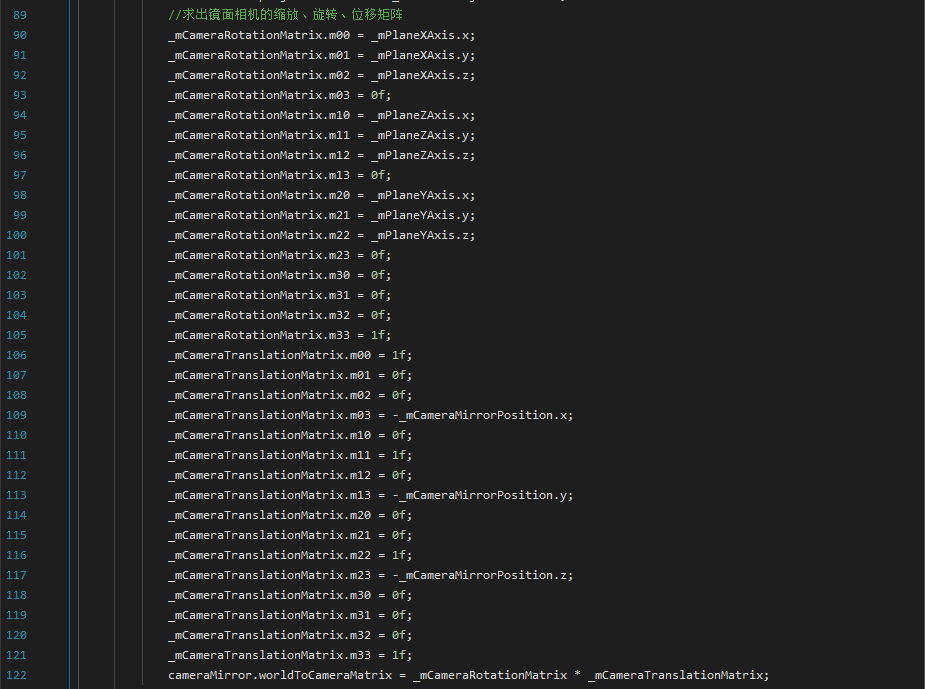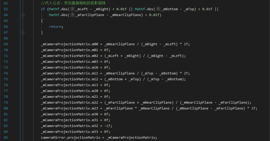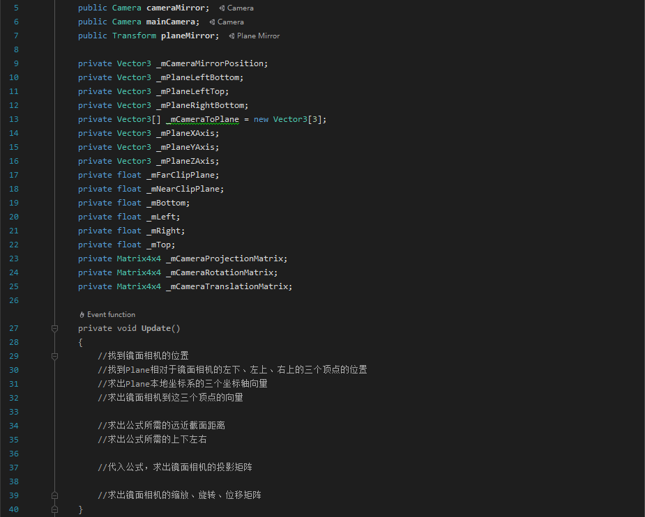 游戏中的镜子算是比较常见的一个效果,我们可以利用一个RT相机,在镜子的另一侧,与观察者对称的位置渲染出镜中图像。首先写出代码的结构: 大致分为四步骤:先算出必要的向量与坐标,然后算出公式中所需的远近裁面距与裁面上下左右六个参数,接着带入公式求得RT相机的投影矩阵,最后设置RT相机的转换矩阵。