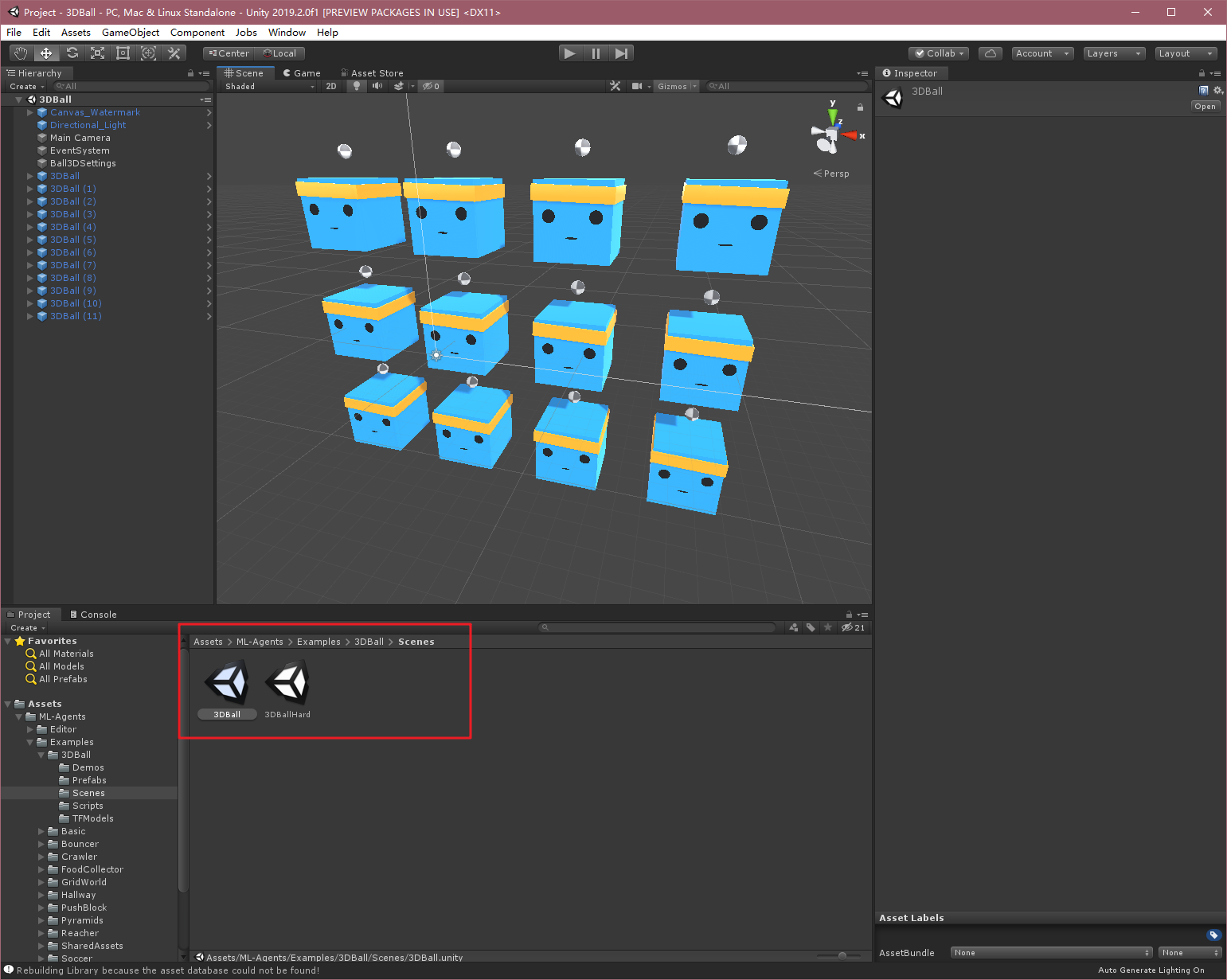 打开项目后,我们在Project->Assets->ML-Agents->Examples->3DBall->Scenes->中找到3DBall场景,如下: