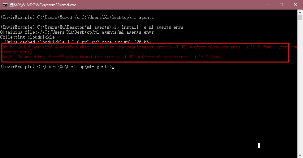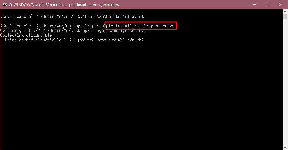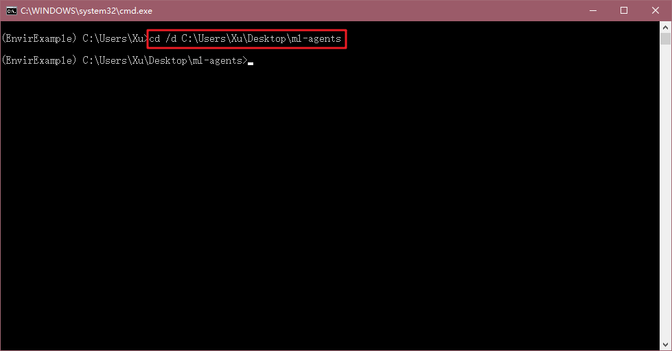 到这里后,我们cd到之前下好ml-agents源码解压的地方,例如我这里是桌面地址,则输入如下命令:cd /d C:\Users\Xu\Desktop\ml-agents ,然后回车。