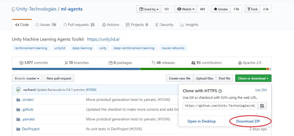 下载地址:https://github.com/Unity-Technologies/ml-agents