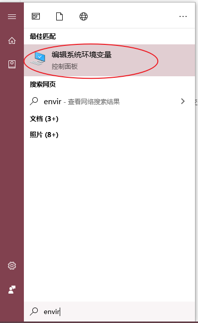 在开始菜单中,搜索“envir”,总之进入“编辑系统环境变量”。