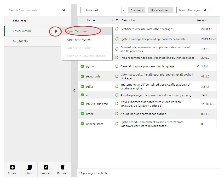 建立成功后,例如我建立的环境叫“EnvirExample”,然后点击三角符号,“Open Terminal”,这个时候我们就进入命令台模式了,之后都需要在这里输入命令进行操作。
