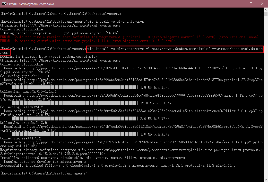 pip install -e ml-agents-envs -i http://pypi.douban.com/simple/ --trusted-host pypi.douban.com
