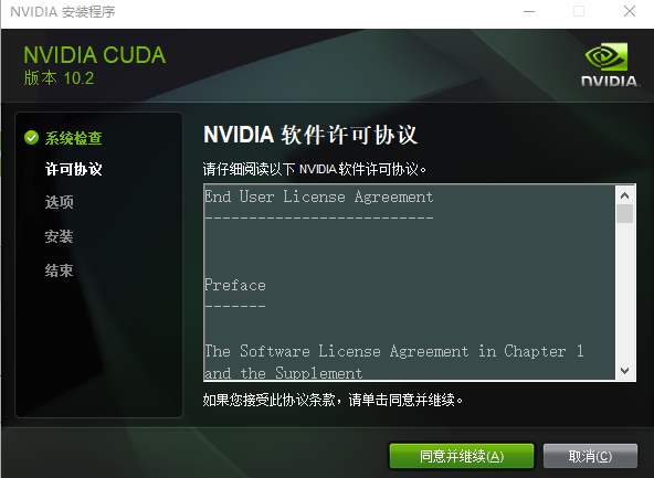 如果CUDA版本与显卡版本匹配的话直接显示许可协议同意,如下图。
