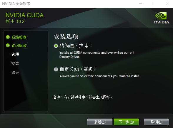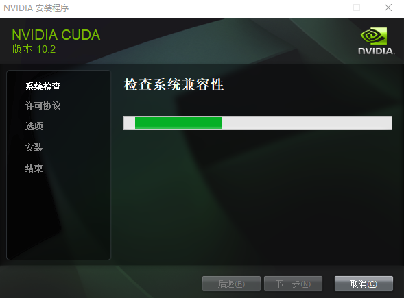 注意:这里会检查系统的兼容性,如果不兼容的话,它会有Warning的提示,要是没有直接显示同意NVIDIA软件许可协议的话,就要注意了,这里应该是CUDA的版本与你的显卡不兼容,所以可以试着换个低版本的CUDA下载安装。