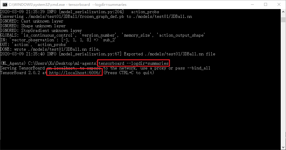 打开我们之前在Anaconda中的控制台,之前安装完环境应该还没关,当然要是关了重新打开的话,记的还是要选择我们创建的环境,我的是“EnvirExample”,然后打开Terminal。同时还要cd到ml-agents的目录去,我的在桌面,则输入:cd /d C:\Users\Xu\Desktop\ml-agents 。