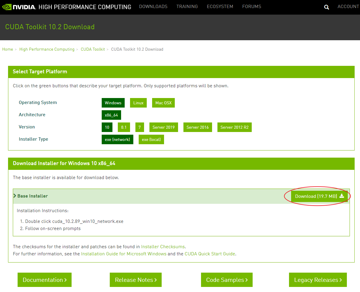 [20200318更新]注意:之前关于下载CUDA与cuDNN的版本我写错了。如果要想用Tensorflow利用GPU进行训练,就需要Tensorflow、CUDA、cuDNN的版本对应一致。之前我弄错了!我们后面用的Tensorflow的版本是2.0.1,所以对应CUDA的版本应该是CUDA v10.0,而相应的cuDNN v7.6.5即可,下面的截图都是我之前错误的10.2.89版本,是不能用GPU进行训练的(虽然还可以用CPU进行训练)!!!但是安装过程都是一样的。因此后文修改一下文字内容,图片就不改了。!一定要先看到这一行~别搞错了!