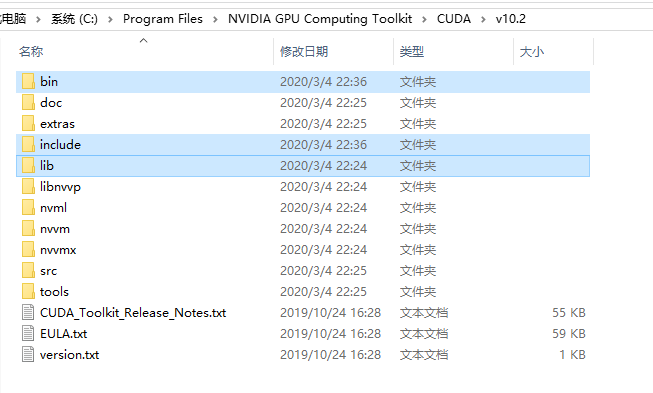 解压之后,将解压文件中的“bin”、“include”、“lib”三个文件夹覆盖到之前CUDA安装的路径下,如果之前CUDA安装时未改路径的话,应该是这个路径:C:\Program Files\NVIDIA GPU Computing Toolkit\CUDA\v10.0