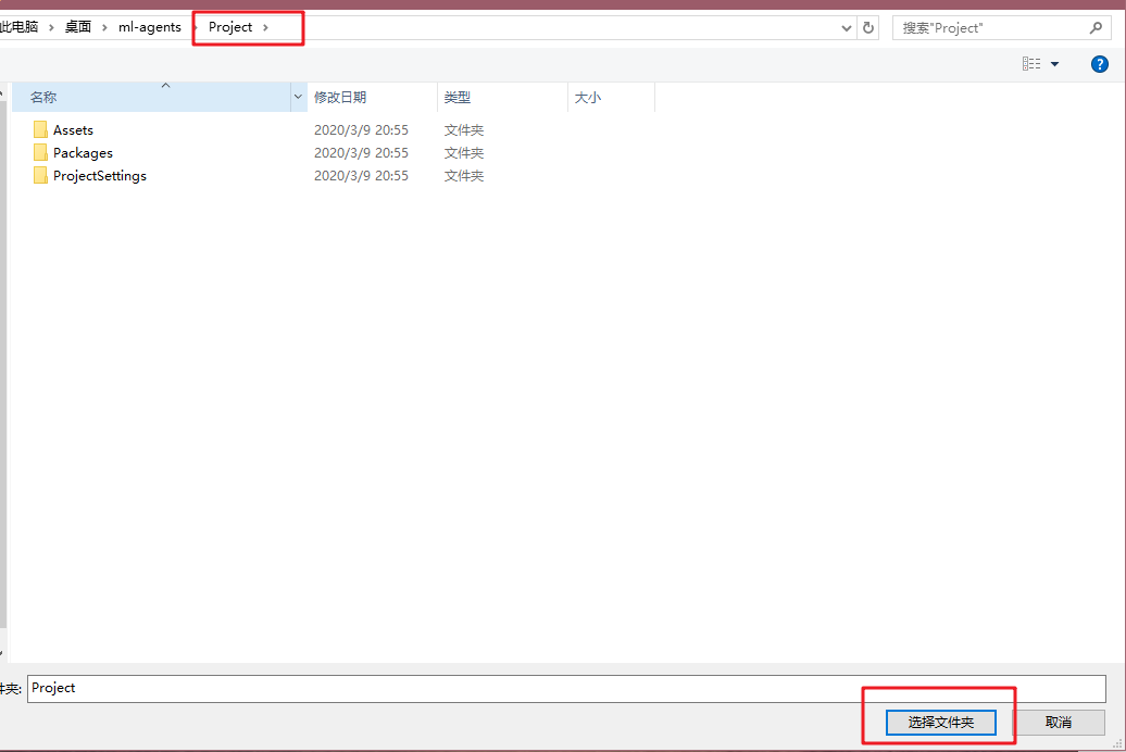 我们这里直接用一个ml-agents官方的实例来实验一下,先打开Unity,打开官方的项目,官方项目就在ml-agents源码的“Project”文件夹中,如下图: