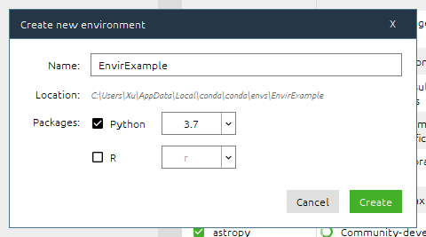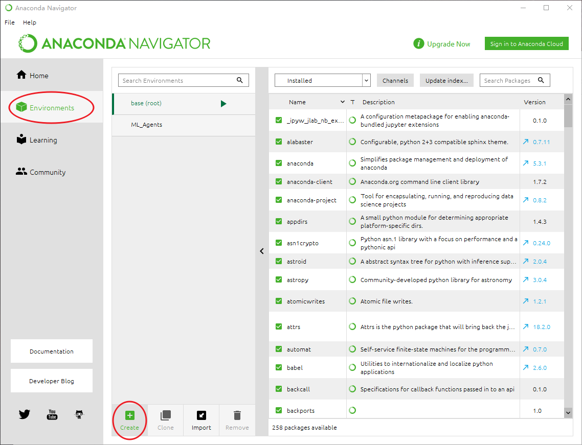 运行后找到“Environments”,新装的里面只有一个“base(root)”,我这里之前已经建立好了一个ML_Agents,不用管它,我们新建一个,点击“Create”。如下图: