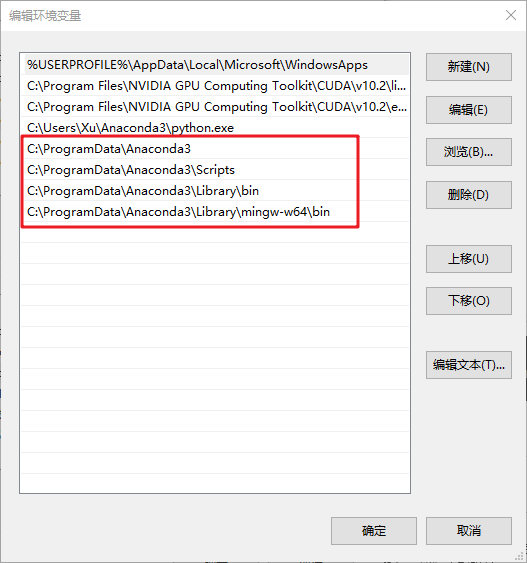 这一步应该不是必须的,但以防万一,还是配置一下。还是进入“编辑系统环境变量”,在系统变量(或用户变量)的Path里新建以下四个地址(这里的地址是根据之前Anaconda安装路径来设定的,我这里的路径是默认路径):