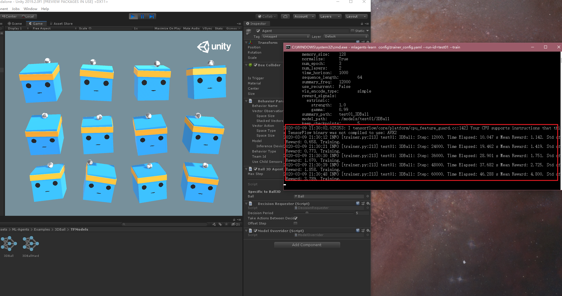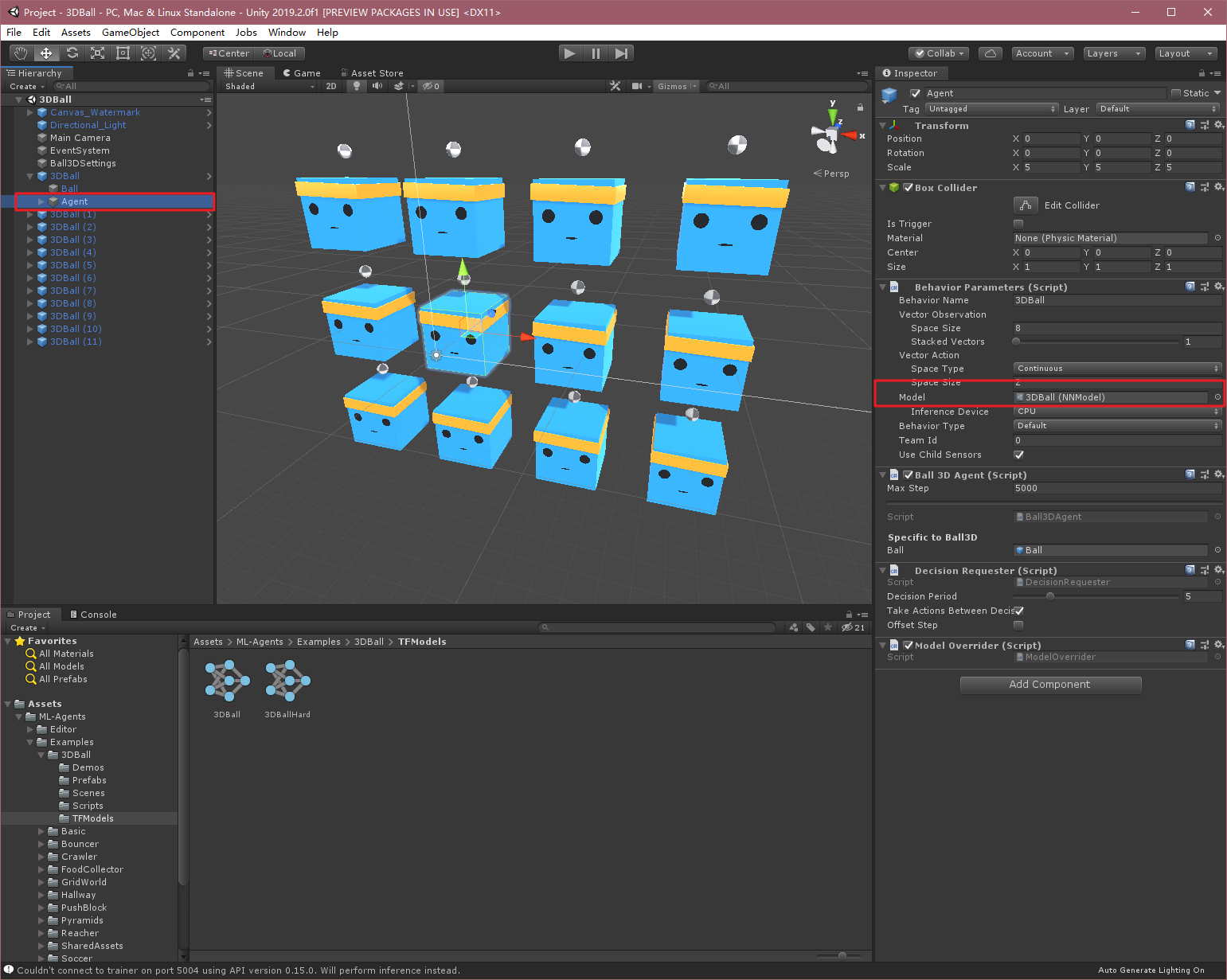 这里我们可以直接运行,可以看到12个小平台努力不让球掉落,这里每个平台的Agent已经有官方训练好的Model了,后缀名为.nn,如下图: