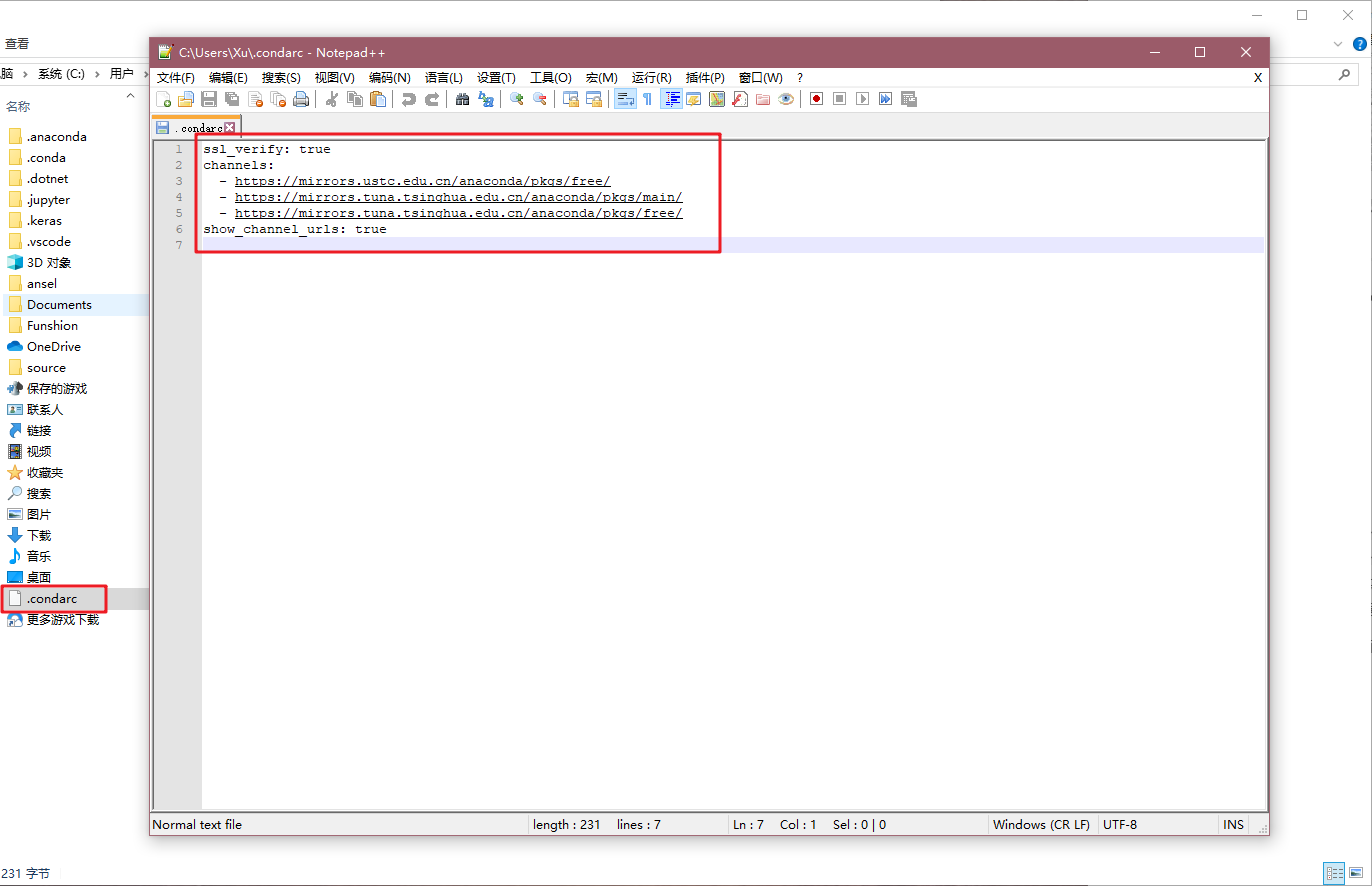 所以需要换下载这些库的地址,方法很多,网上很多是敲命令行,我这里直接修改配置文件来换源。找到C:\Users\<你的用户名>文件下,有一个名为“.condarc”文件,则是Anaconda的配置文件,打开进行编辑。