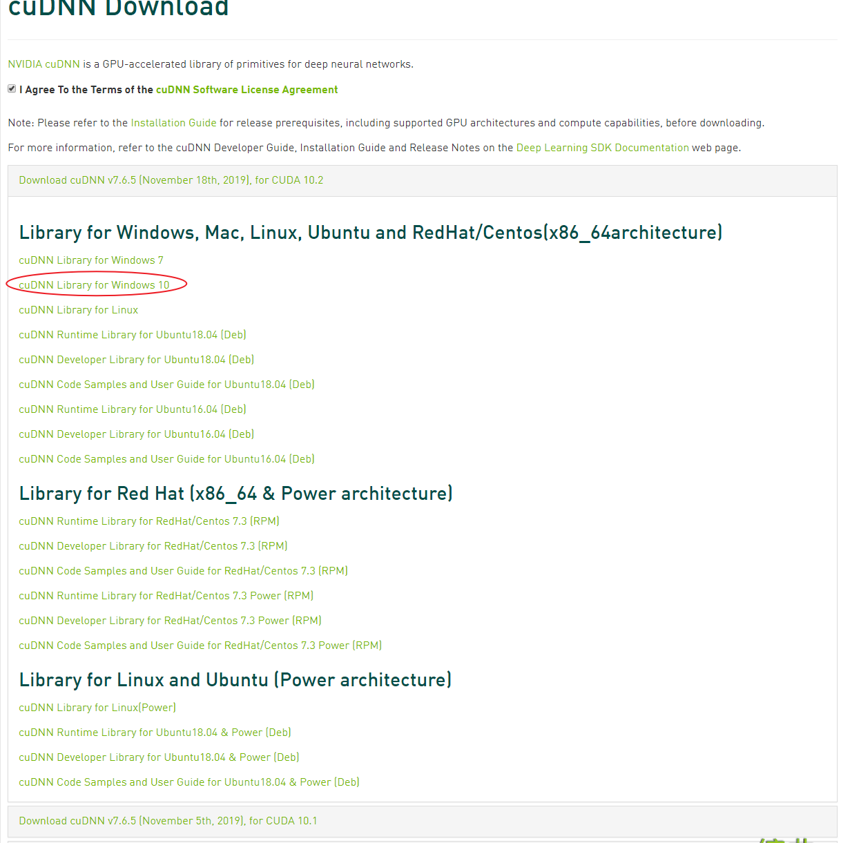 这里我们选择和之前CUDA对应的版本来下载,之前我们下载的是CUDA 10.0,因此选择第三个。打开选项后选择对应系统版本进行下载,我们这里选择Win10。