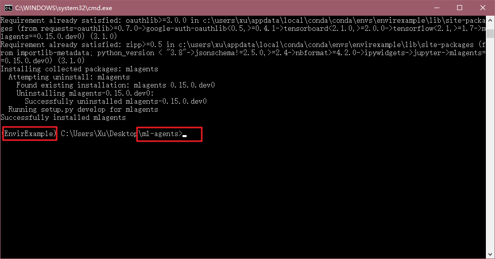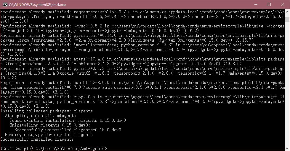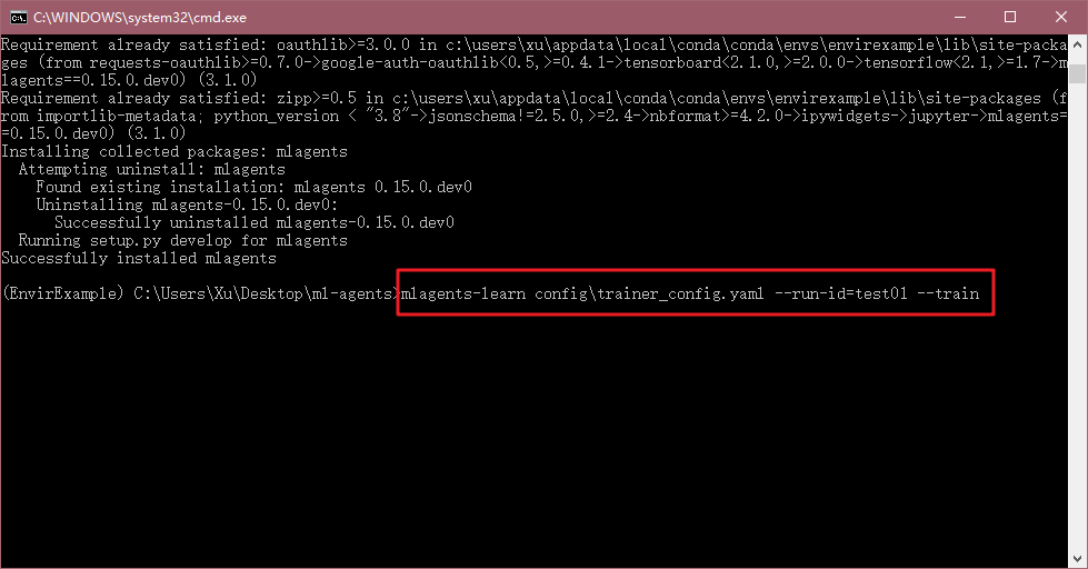 总之需要满足前面括号里是你创建的环境,后面是ml-agents源码目录。