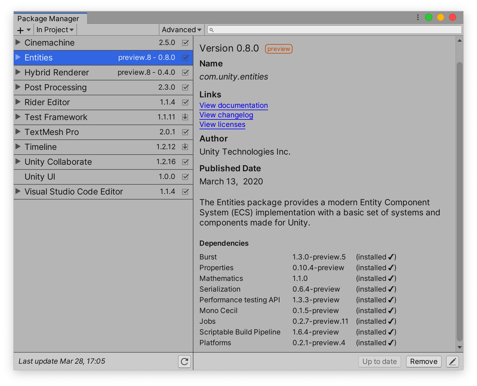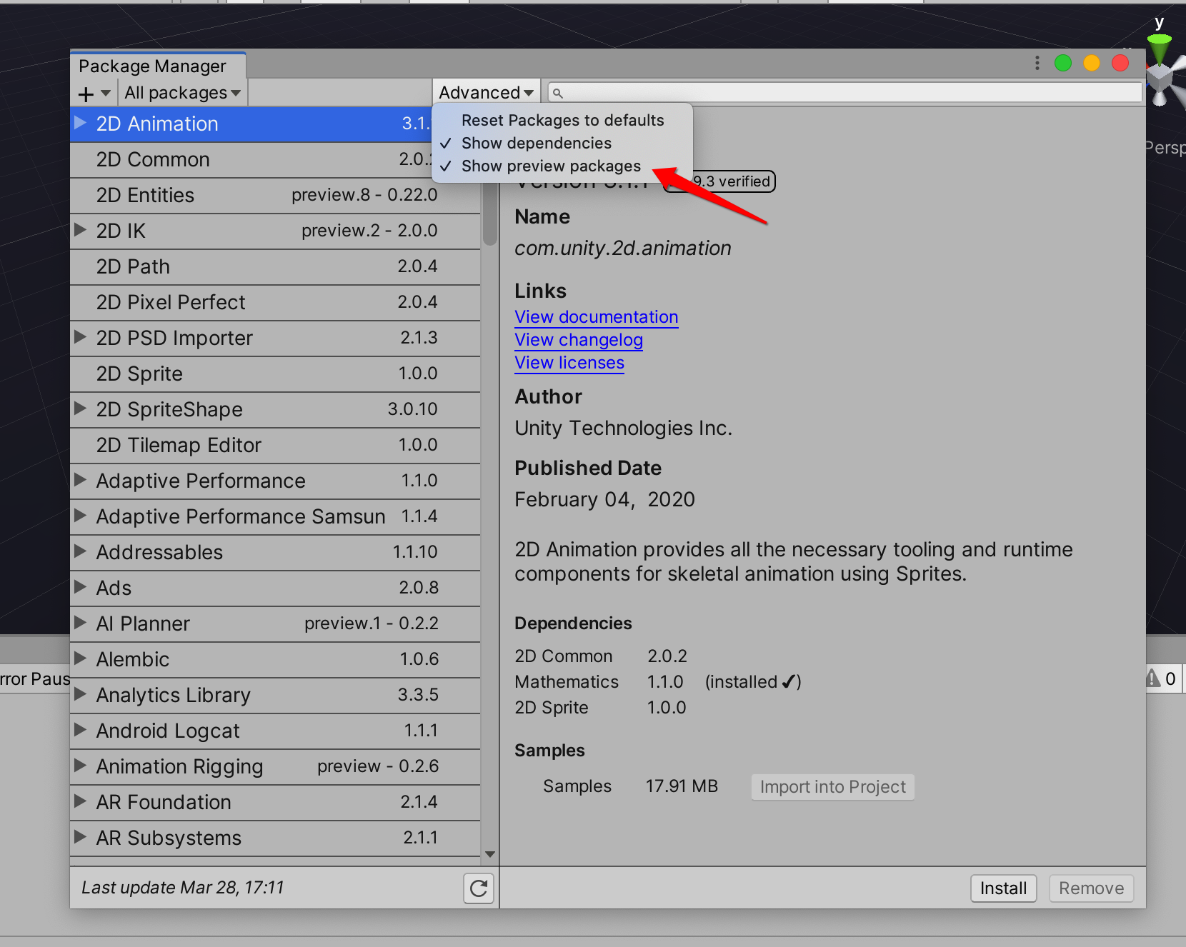 5.接下来我们点击Unity工具栏的Window>Package Manager,安装好所有依赖包。注意,不能简单按照manifest.json的文件里的顺序安装所有package,因为那里列出来的package是展开依赖关系后的扁平化的package列表。应该找到最上层的package包来安装。那么怎么判断哪些是上层的package呢,你可以在Package Manager里搜索package,然后点击它,在右侧看看Dependencies里它所依赖的包,需要点耐心。