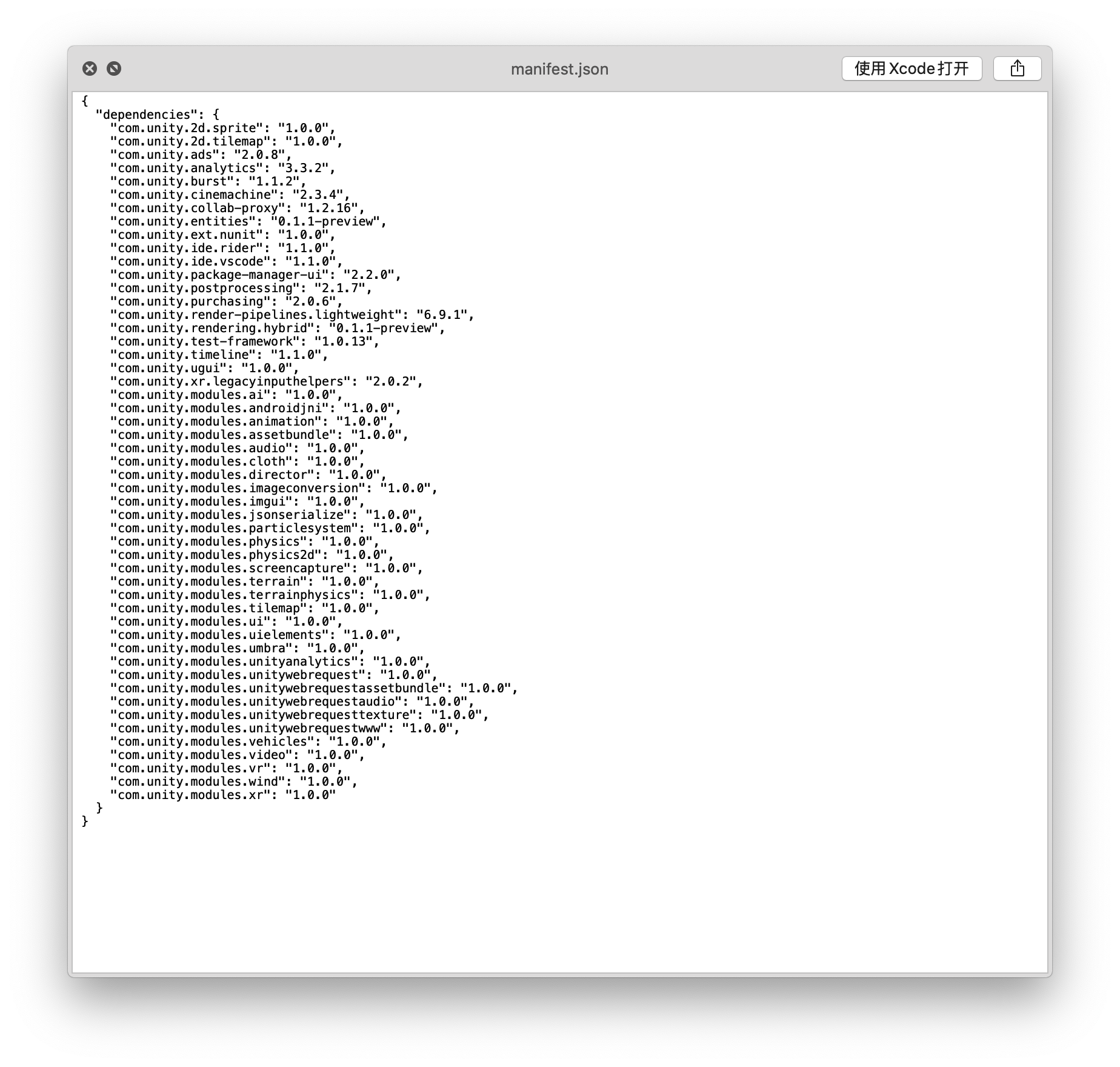 那么我只能尝试第二种方法。 1.根据旧工程的特点,创建合适的新工程(2D,3D,HDRP,Universal等等) 2.将旧工程里的Assets文件夹里的内容全部拷贝到新工程的Assets文件夹中 3.打开新工程 理论上应该可以打开工程。这样就可以了吗? 事情没这边简单,我们忘了一个非常重要的步骤,那就是Packages/manifest.json。这个文件是整个工程的依赖配置文件。