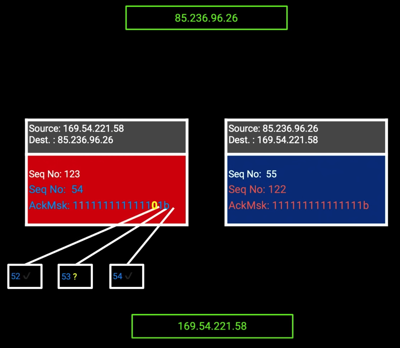 实际中可能会出现多个消息漏掉,每个消息还会发送一个16位的掩码,用于记录之前的16个消息是否已经完全收到。比如之前的16个消息全都收到了,那么对应的掩码就是 1111111111111111,如果前5个消息都没有收到反而收到了最新的消息,那么对应的掩码就应该是1111111111000001 ,其中0表示没有收到,1表示收到了。