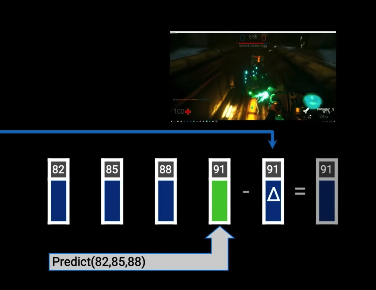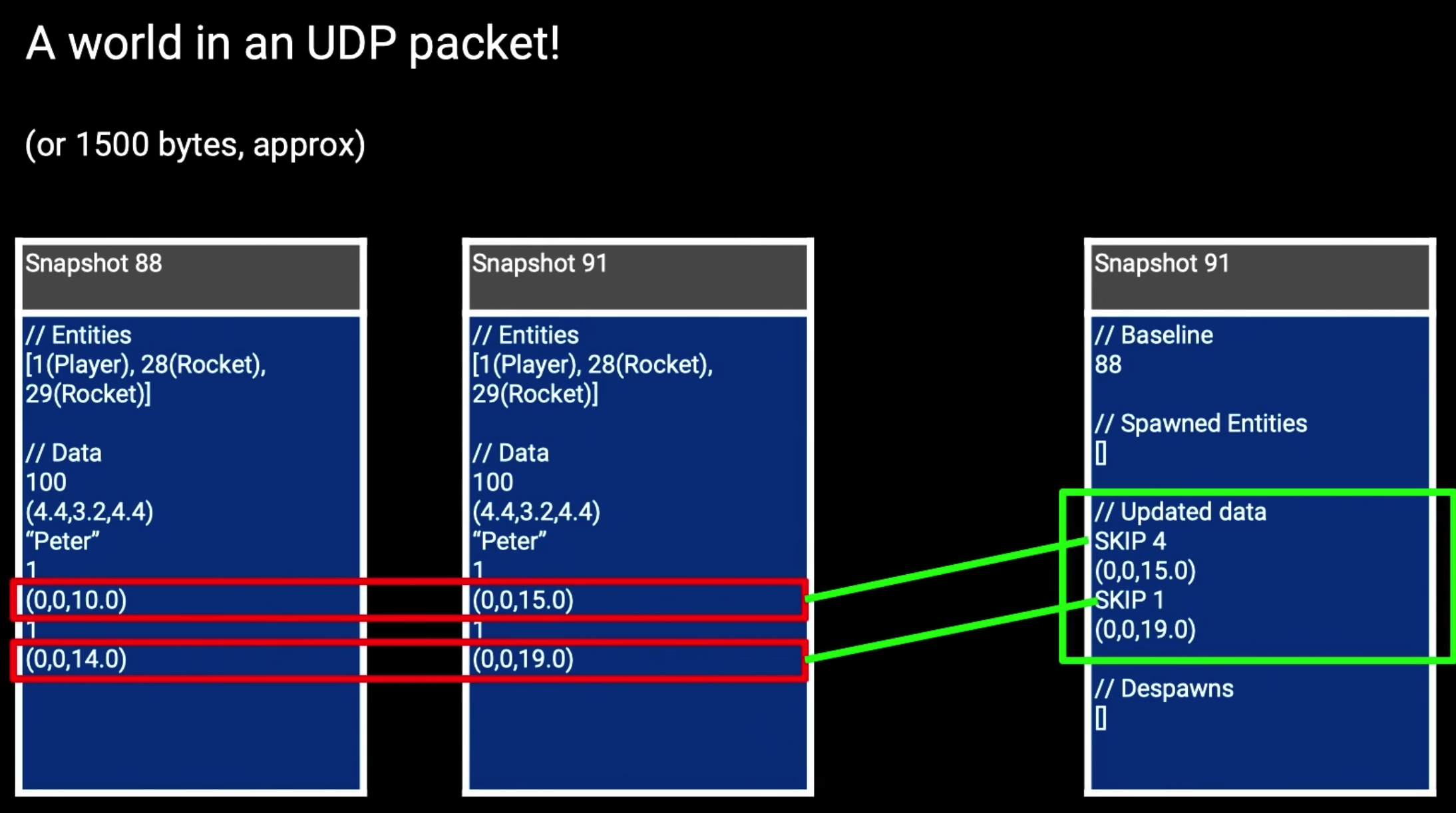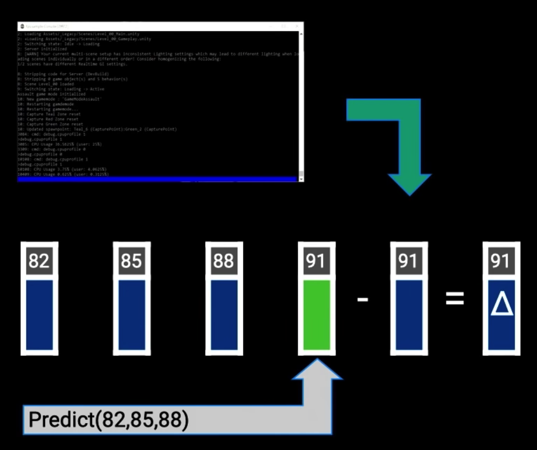 这里还有个优化协议包大小的技巧,首先服务端和客户端本地都有一套相同预测包的代码,服务端现在有数据包82 85 88 91,此时如果直接将91发给客户端包体是比较大的,所以服务端先根据82 85 88预测出91的数据包,然后将预测的91数据包减去实际计算的91数据包得到一个91数据包的变化值,只将这个91数据包的变化值发给客户端,这样包体就小很多了。