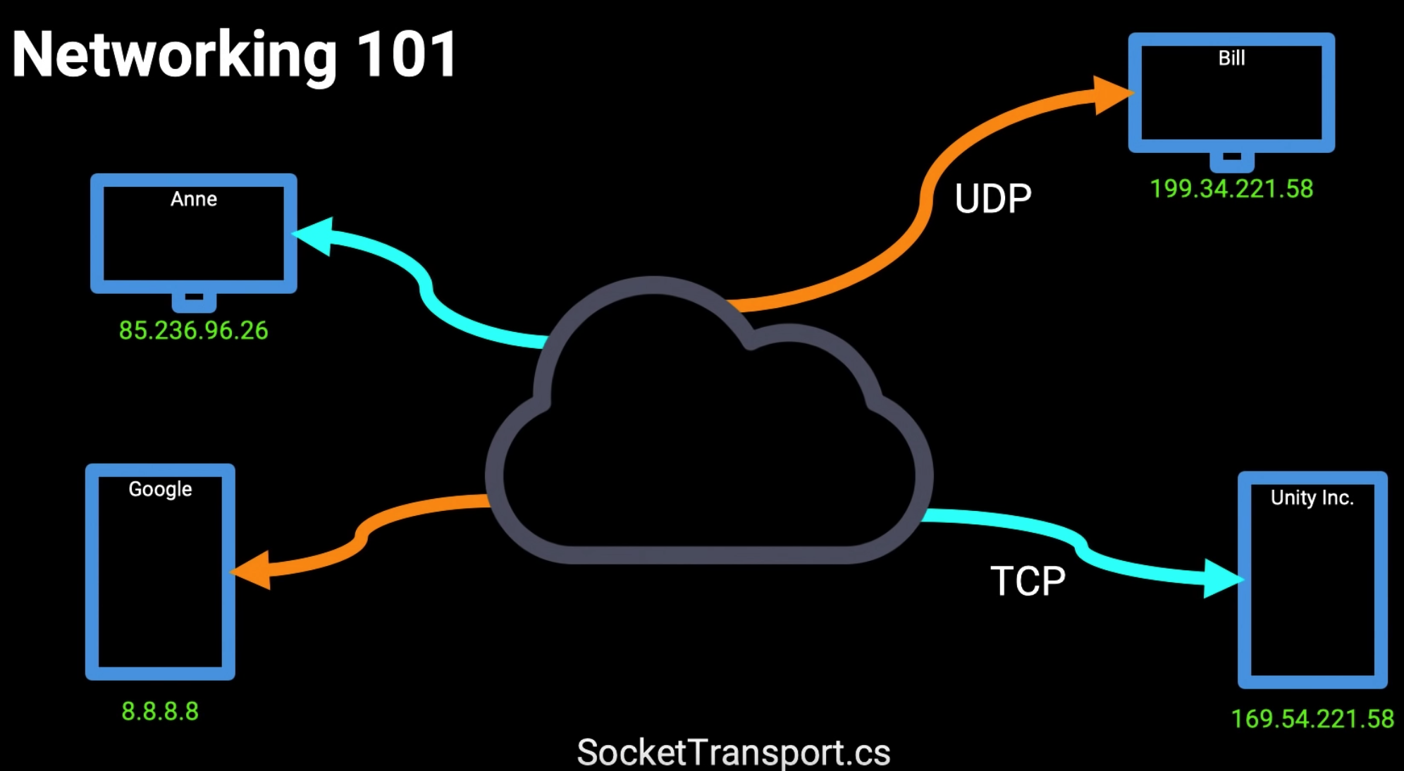 网络传输中我们有两种协议UDP和TCP,每个终端都有自己的IP,通过网络传输协议与对应的服务端进行交互。Unity inc使用的就是TCP协议,而Google使用的是UDP协议。