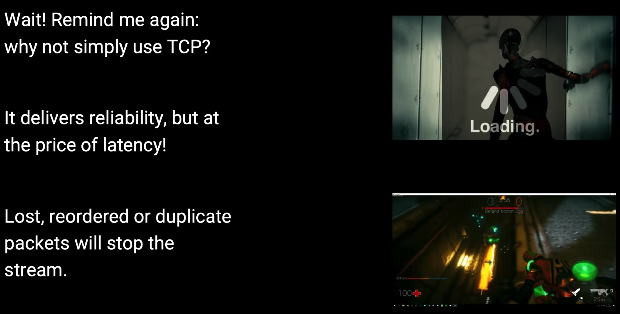 为什么FPS要使用UDP?我觉得有个重要的原因,UDP虽然会出现丢包和错序问题,但是客户端可以通过前后两个包插值出中间包的数据,也就是数据包预测机制。还有就是自己维护一套可信赖的UDP可以根据项目的情况定制性,效率肯定比TCP要高。