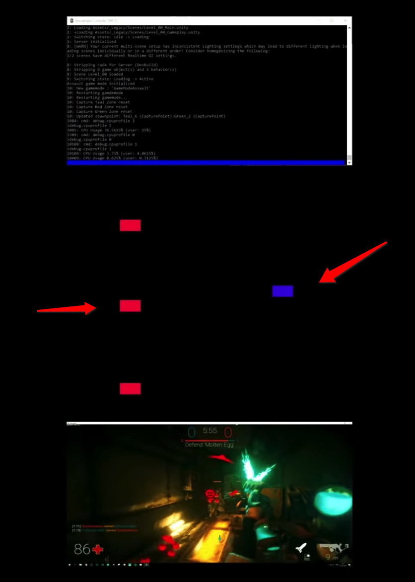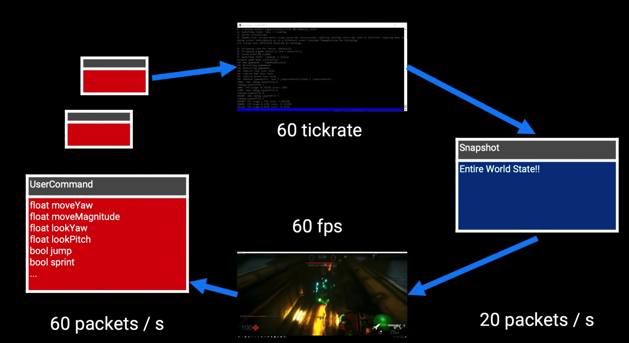 客户端和服务端都是电脑主机,只是服务端不需要渲染、用户输入等操作。不同的是客户端只用处理自己本机的数据,而服务端需要处理多台客户端的数据。它们进行网络交互,红色的方块表示客户端向服务器发送的数据,蓝色的方块是服务端回复客户端的数据。