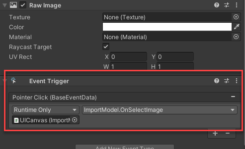 在使用unity UI组件的时候,我们可以通过为button按钮添加onClick事件函数来处理按钮点击,可是如何为图片框添加点击事件呢?其实也很简单,就是通过在组件中添加EventTrigger组件,并设置好相应的事件函数就好了,如下图所示: