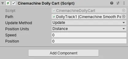 ,这会创建出来一个CinemachineSmoothPath和CinemachineDollyCart。也可以直接给GameObject添加CinemachineDollyCart组件。