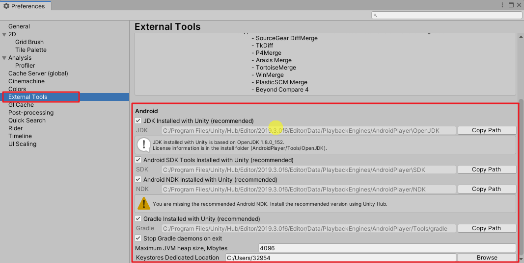 如果使用Unity Hub安装了内置的JDK和Android SDK,Unity会自动勾选使用内置的SDK。
