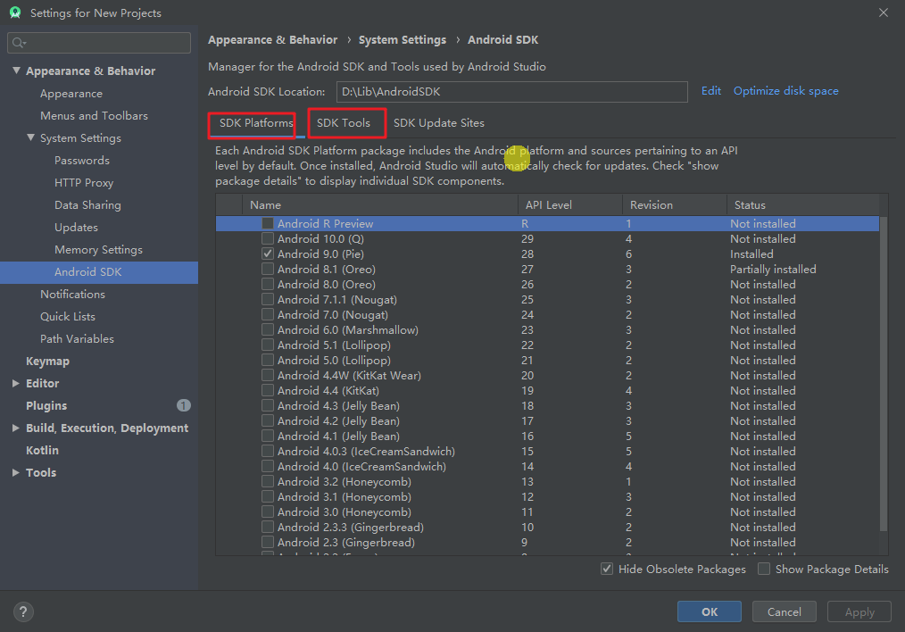 更新Android SDK时,除了打开的首屏,显示的是SDK Platforms中可以更新; 记得还要