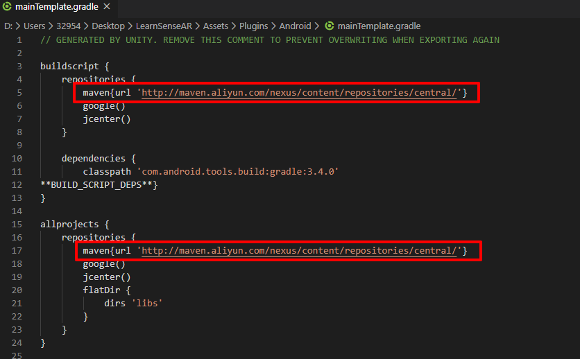 Unity2019.3及之后在工程内生成的mainTemplate.gradle中没有repositories设置,所以只能修改Unity安装目录里面的.gradle模板。 路径在: