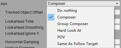 CinemachineVitualCamera组件中的Aim属性用于设置相机