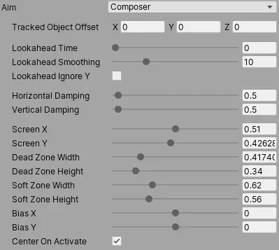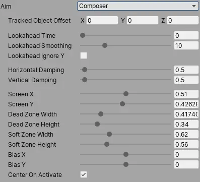 soft zone的宽度。如果目标出现在屏幕的此区域中,则相机将旋转,以在Horizontal Damping设置的时间内将其推回dead zone。