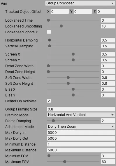 这个算法可以用来让镜头瞄准多个目标。如果Look At属性设置的是一个Cinemachine Target Group,这个算法会调整相机的FOV和举例来保证Group中的物体都能被镜头看到。如果Look At属性设置的是一个物体,那么会和Composer算法表现一致。