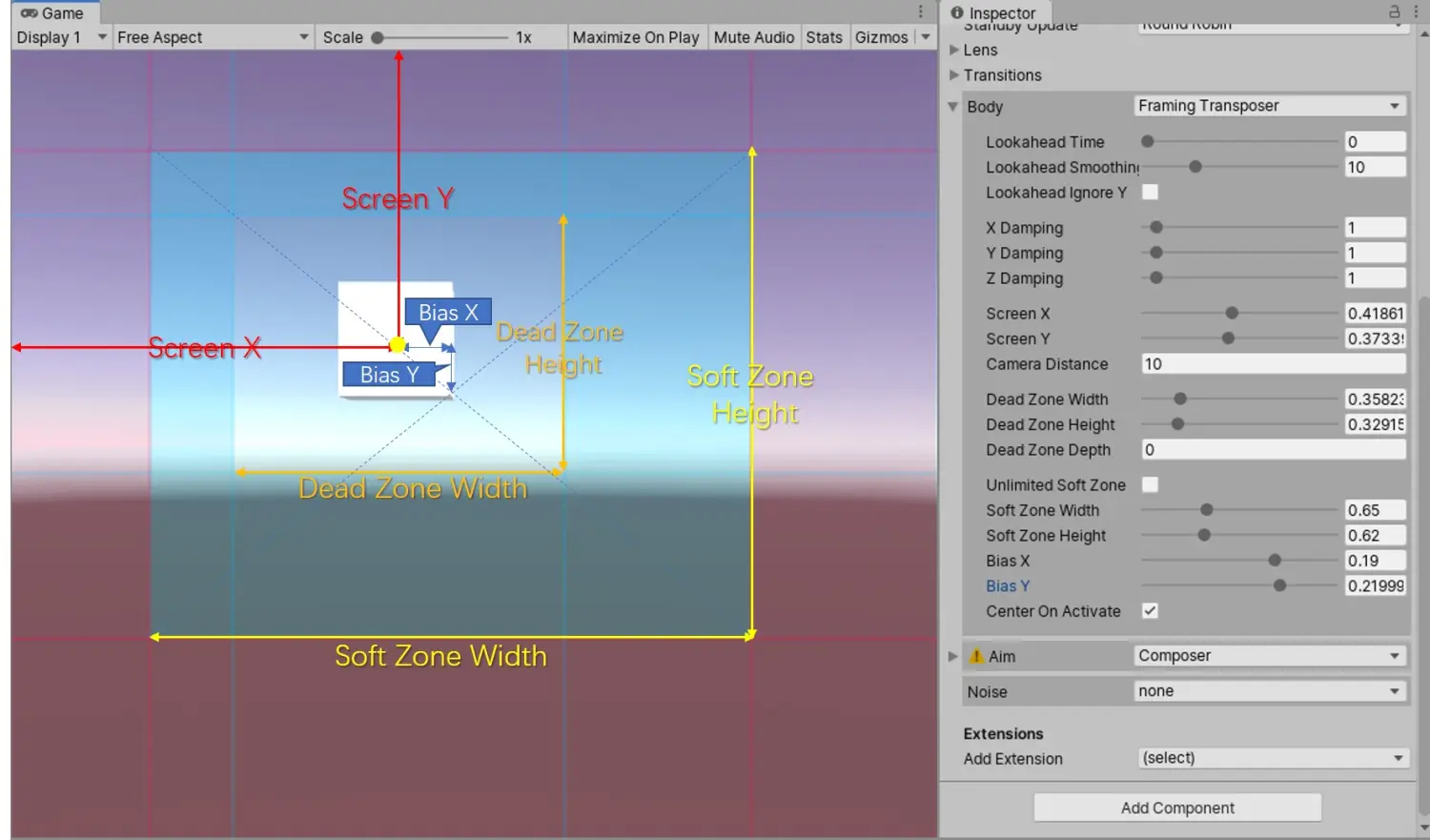 soft zone的高度。如果目标出现在屏幕的此区域中,则相机将旋转,以在Vertical Damping设置的时间内将其推回dead zone。