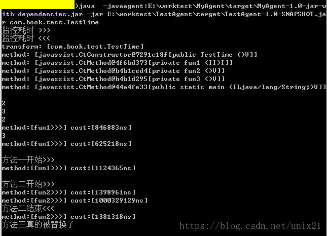 java -javaagent:E:\worktest\MyAgent\target\MyAgent-1.0-jar-with-dependencies.jar -jar E:\worktest\TestAgent\target\TestAgent-1.0-SNAPSHOT.jar com.book.test.TestTime