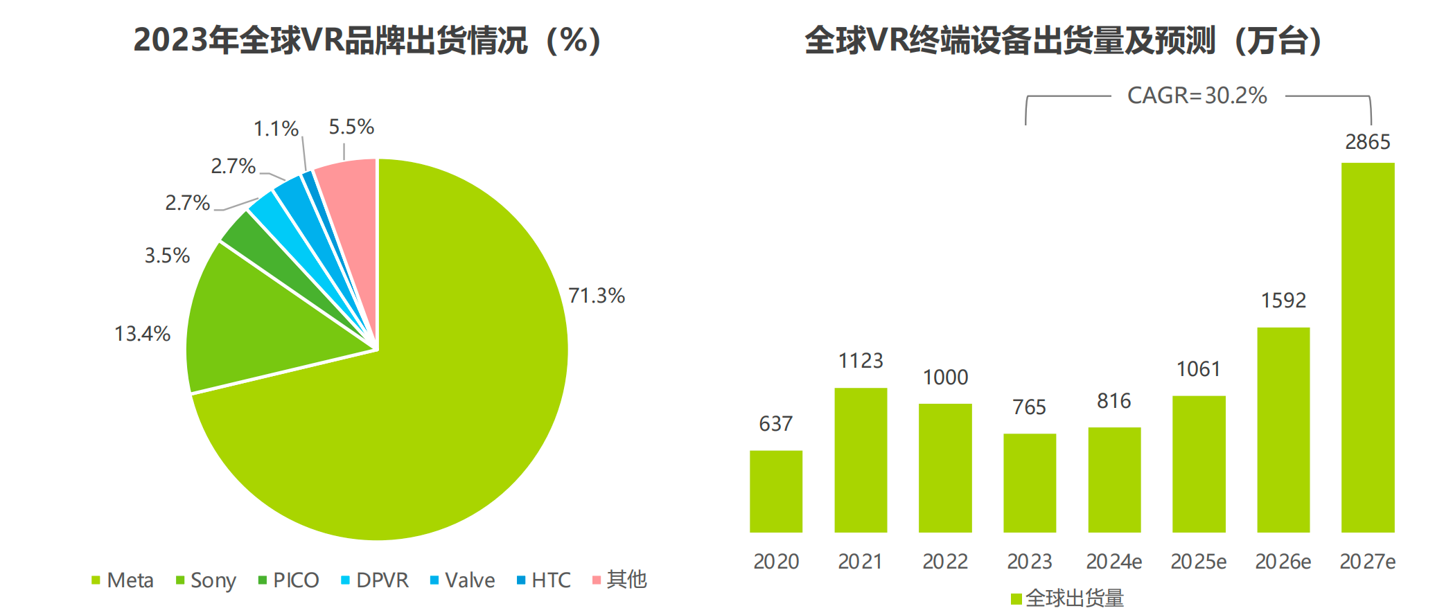 VR 产业作为虚拟现实产业中的重要组成部分,是指利用计算机设备创建一个三维空间的虚拟世界,用户可以运用视觉、听觉等感知这个虚拟世界,并与虚拟世界中的场景、物品、虚拟人物进行交互。基于多源信息融合、交互式的三维动态视景和实体行为的系统仿真,用户如同身临其境一般。广义的虚拟技术包括泛R(Reality)技术以及全息技术等虚拟技术;狭义的虚拟技术即指VR技术。相较于AR与MR, VR本质在于利用先进技术构造虚拟世界,侧重完整的虚拟现实体验,通过良好的VR体验让体验者忘记身处的现实;因此VR对图像的逼真度要求更高,尽可能让虚拟场景占满整个视野,避免真实场景画面进入眼睛。从 2016年这个 VR 元年开始,硬件巨头消费级产品的推出,叠加中国众多VR创企大力进军硬件端与内容端,短期市场呈爆炸式增长。但行业整体处于民用初期,受内容稀缺、设备易眩晕、屏幕清晰度差等影响,消费级市场整体发展放缓。伴随行业技术日趋成熟与产业玩家的扩容,行业在2020-2022年迈入发展的关键阶段,Quest销量迎消费级拐点。2023年苹果Vision Pro发布,其对全新交互方式的实践为业内玩家带来新的思考。作为现阶段顶配产品,Vision Pro的出现不仅极大拉动虚拟现实产业玩家信心,同时在市场激起的“浪花”,再到 2024 年 LBE VR 大空间出现,众多行业参与者认为 VR 换发了“第二春”重新带动了 VR 产业的发展。