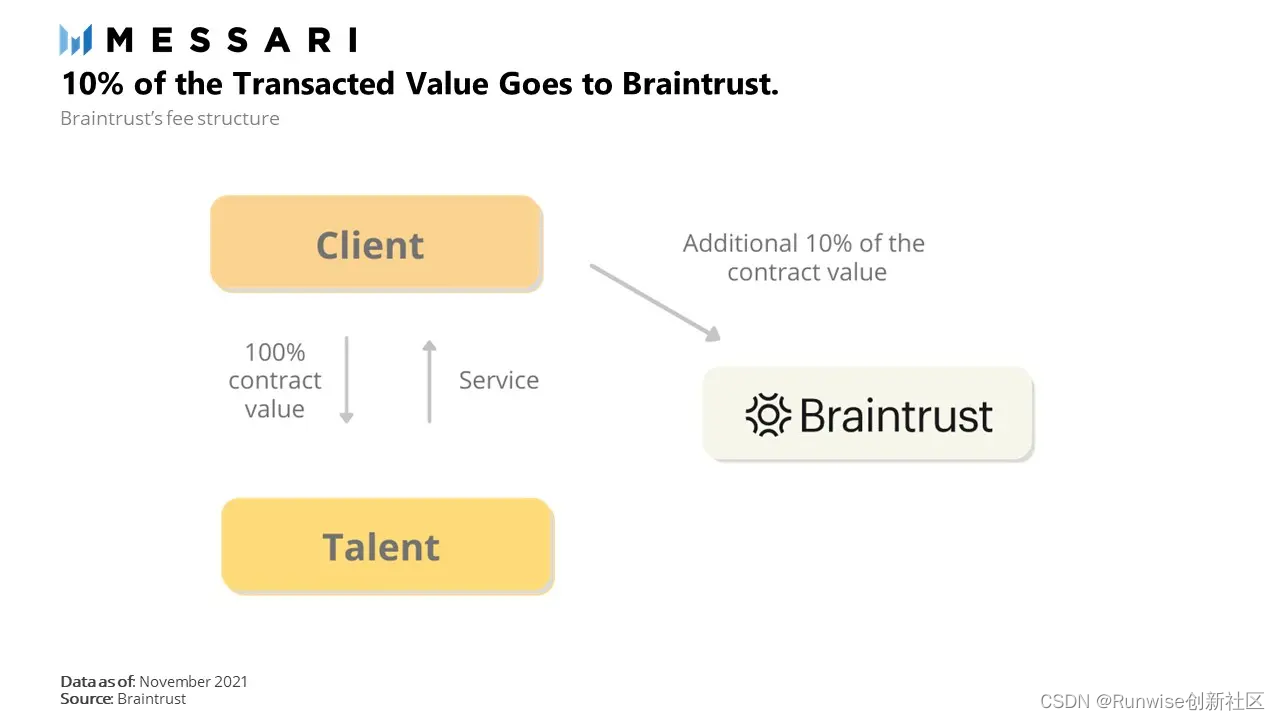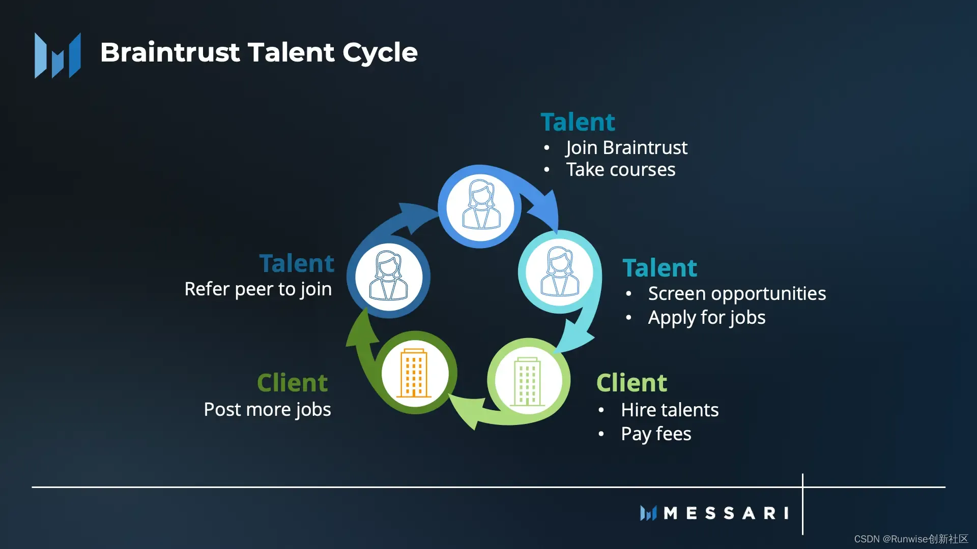 Braintrust专注于工程师、设计师和开发者这三类人才,并仅在企业成功完成招聘时抽取10%的佣金。对于前期注册的用户和对平台运营有贡献的人,还会发放代币作为奖励。由于这种创新的招聘模式,Braintrust得到了广泛的认可,成为了Web3项目的典型代表