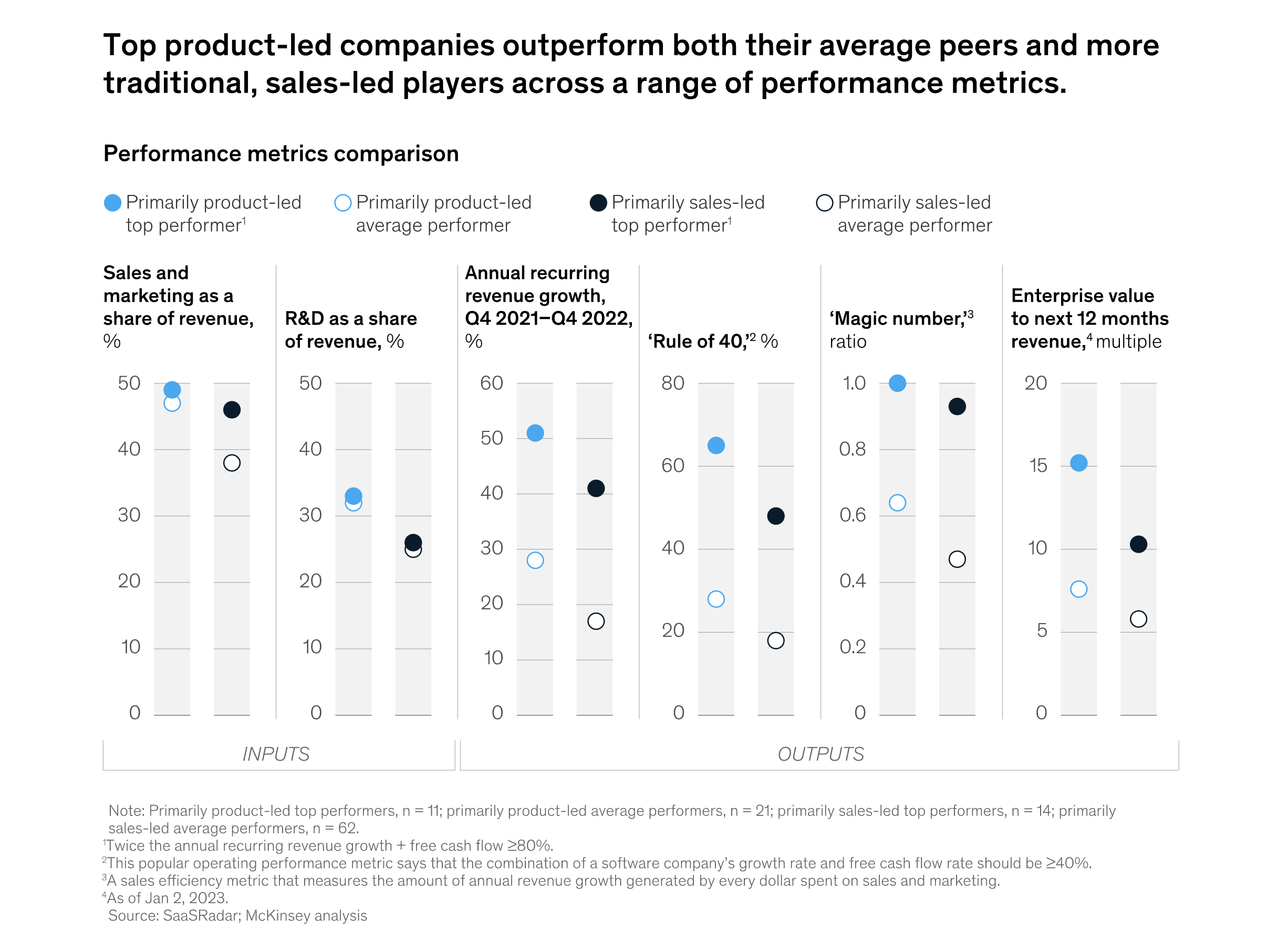 少数以产品为主导的表现出色的公司与其他以产品为主导的公司以及更传统的、以销售为主导的公司之间在一系列重要的 B2B 业务指标上存在着明显的差异。