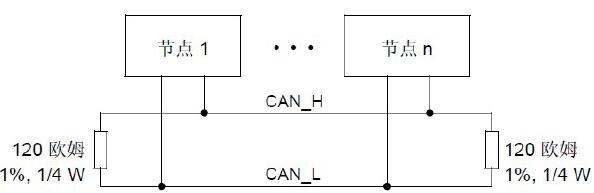 CAN 总线终接 CAN 总线线路必须用在 CAN_L 和 CAN_H 线之间每端连接的120 欧姆电阻来终接,如下所示。