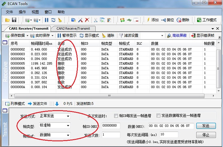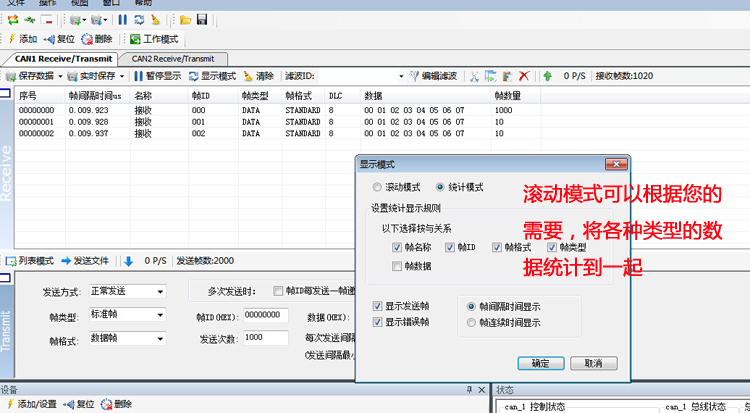 汽车CAN总线上有很多节点都是周期式的向总线上重复发送同样的数据,与ECU通信,而这些相同的数据往往会使数据分析人员眼花缭乱,对总线上其他有用数据的分析造成干扰,灵活使用接收统计功能,可以将重复循环发送的数据合并成到一起,此时如果总线上有新数据发出,即可直观的看到。