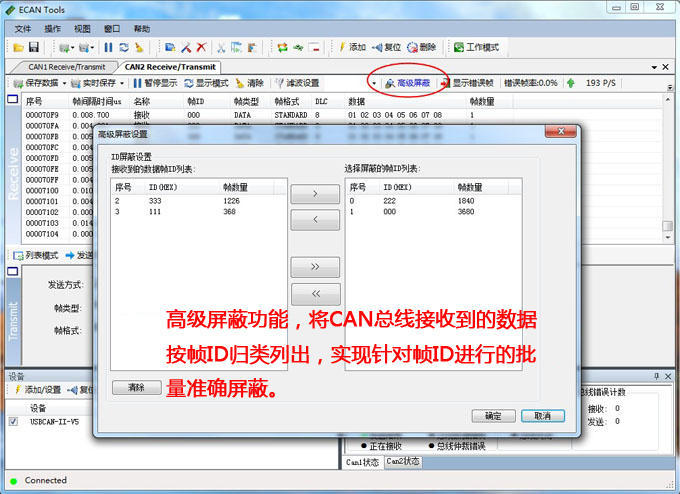 此功能可用于过滤只想看的帧ID,如用户仅对某段帧ID发送的数据感兴趣,可通过设置滤波的方式,将此段数据直观的显示出来。