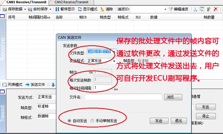 文件发送功能可将批处理文件(.CAN)按接收时的时序信息,发送回CAN总线,批处理文件可通过记事本编辑,编辑后的文件可以实现按用户实际写入的内容进行发送。