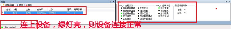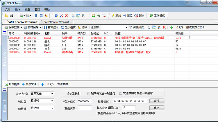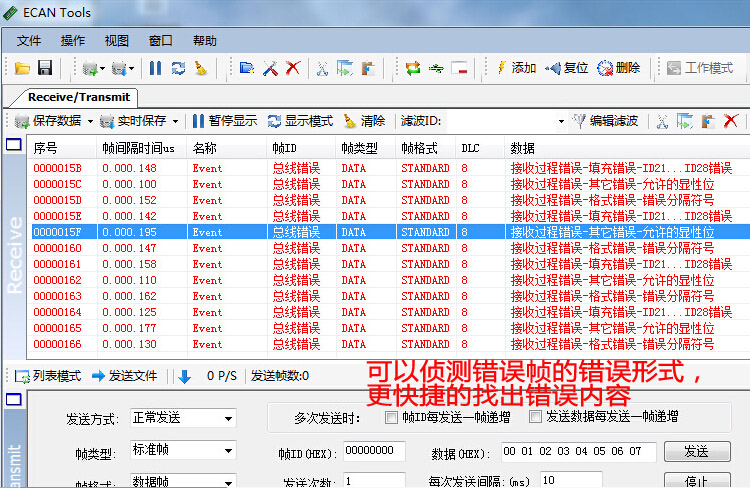 软件可接收到总线上的错误帧。当总线上产生错误帧时,一定会对总线造成干扰,而严重时会导致总线完全瘫痪。ECAN Tools软件可接收错误帧类型及状态,以便于用户及时发现总线通信故障节点,及时对其进行维修或更换。