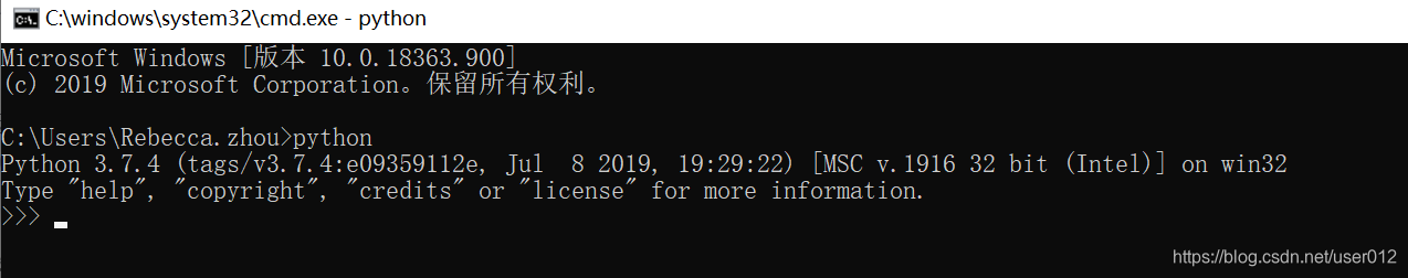 安装之后,验证有没有安装成功:win+R -> cmd-> 输入python,如果出现以下关于python的版本信息,表示安装成功。