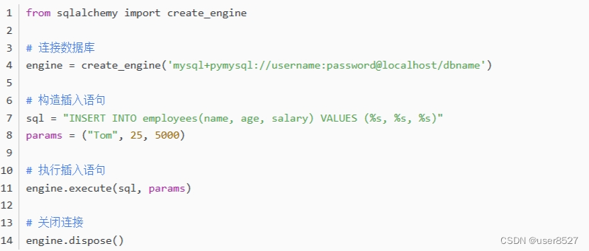 本文介绍了如何使用pymysql连接MySQL数据库,包括设置参数如用户名、密码等,以及使用SQLAlchemy进行SQL查询、更新和删除数据的过程,包括基于SQL语句和ORM的方法。